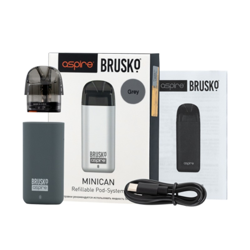 Komplektā ietilpst Pod Brusko Minican x Aspire 1 gab, brusko x Aspire minican kasetne 1,0 omi (3 ml) 1 gab, USB/mikro-USB kabelis 1 gab, instrukcija 1 gab.
